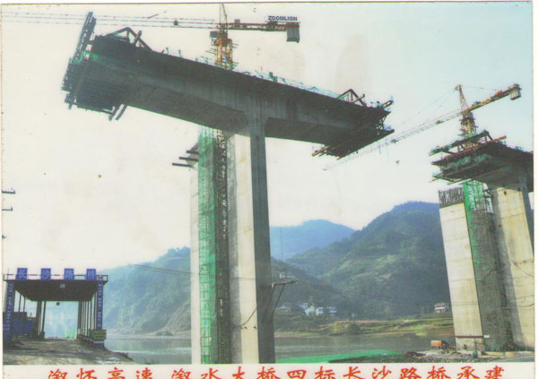 溆怀高速溆水大桥四标由长沙路桥承建,采用我公司HBT60-1616-90Es输送泵一台垂直泵送60米水平距离200米 C50砼实现成功浇注